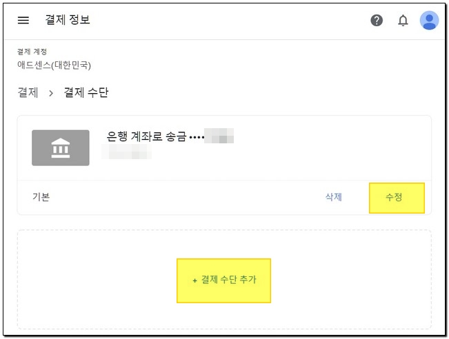 지급되는 방법이 추가되면 ‘결제수단 추가’는 결제수단 관리로 변경되며 결제수단 페이지에서 결제수단 추가를 이용하여 다른 계좌 등을 등록할 수 있습니다. 은행계좌로 송금 설정한 계좌는 수정을 이용하여 변경할 수 있습니다. 수정을 통해 변경하지 않고 결제수단 추가를 이용하여 새로운 수익지급계좌를 등록하여 사용하는 것이 편합니다. 여러 계좌를 등록해 두어도 ‘기본’으로 설정한 계좌에 어드센스 수익금이 지급됩니다.