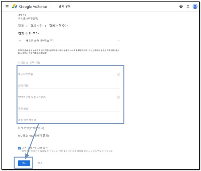애드센스 수익 지급 계좌 정보 입력 후 저장