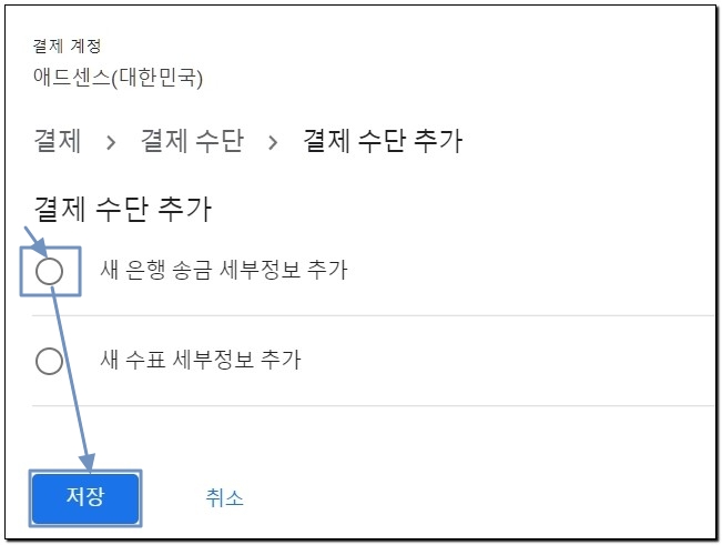 4. 결제수단 추가에서 ‘새로운 무통장입금 상세정보 추가’를 선택합니다. 만약 애드센스 수익금을 수표로 지급받기를 원할 경우에는 ‘새 수표 상세정보 추가’를 선택하여 정보를 입력하면 됩니다.