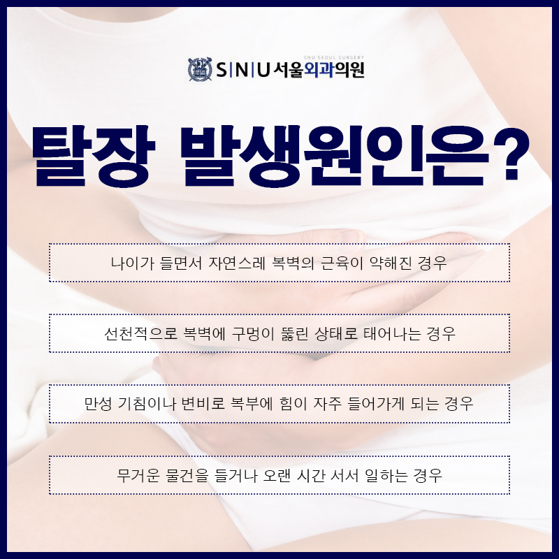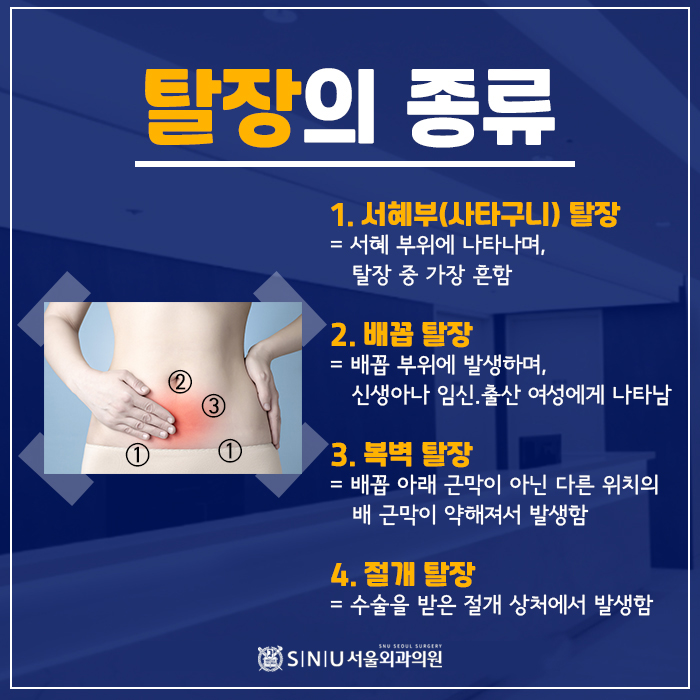 탈장이란? 신체 장기가 제자리에 두지 못하고 다른 조직을 통해 돌출되거나 빠져나가는 증상으로 신체 어디서나 생길 수 있습니다.선천적 또는 후천적으로 다양한 원인에 의해 발생할 수 있으며 대부분의 탈장은 복벽에서 발생하며 서혜부(가랑이 부위)에 가장 많이 발생하여 수술적 치료가 필요한 질환입니다.복벽이 약해지는 중장년층 또는 어린 아이들에게 많이 발생합니다.