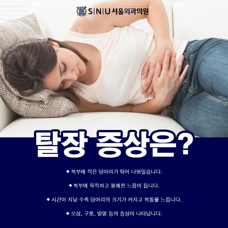 탈장 증상 > – 부드러운 덩어리가 만져지지만 통증은 없다.- 튀어나온 혹을 손으로 누르면 원래대로 들어간다.- 돌출 부위에 압통이 생기고 복통, 오심, 구토, 발열 증상이 있다.