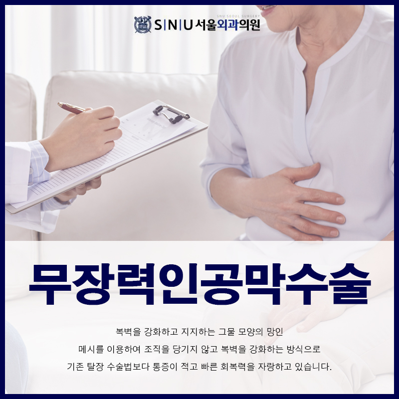 중랑구 탈장병원 SNU서울외과의원은 탈장클리닉을 운영하고 있으며 피부 절개를 최소화하여 시행하는 무장력 인공막 수술을 기본적인 수술 방법으로 사용하고 있습니다.
