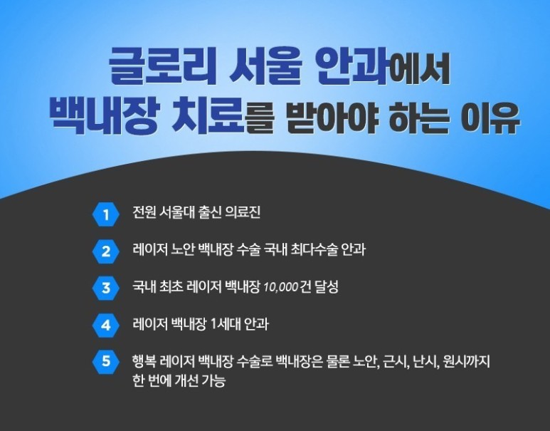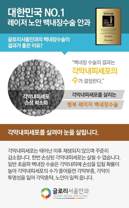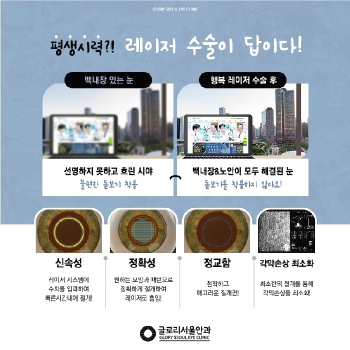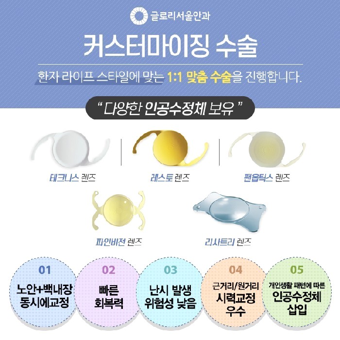 서울백내장 수술을 잘하는 곳을 찾으시는 분이라면 강남글로리서울안과를 통해 검진을 받아보고 시기에 맞는 치료를 하는 것도 눈 건강을 되찾는 방법이 될 것 같습니다.