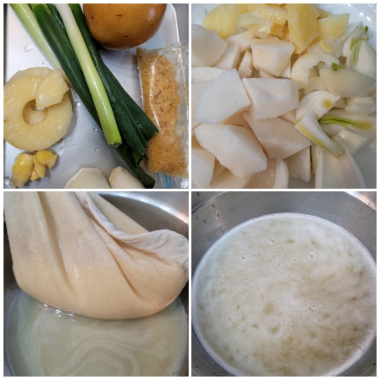 배 1개 파인애플 잘라놓은 거 2조각양파 1개, 마늘 3, 물 종이컵 1컵 넣고 믹서에 잘 섞은 후 면보에 거릅니다.면 헝겊에 걸러 사용하면 고기를 구웠을 때 깨끗해지거나 탈 때도 적게 타기도 합니다.