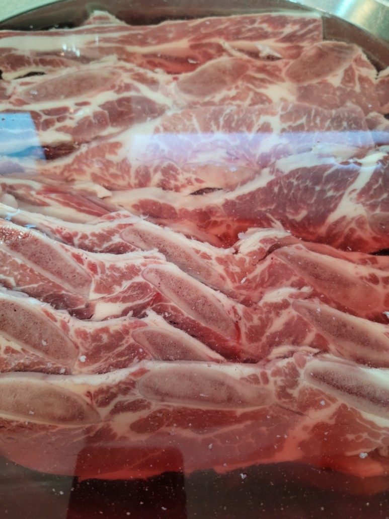 냉동되어 있었는데 물에 담가두면 해동이 되고 피가 나오기 시작합니다핏물을 휙 빼면 좋아요.3시간 동안 물을 여러 번 갈아끼우고 피를 뽑았어요.