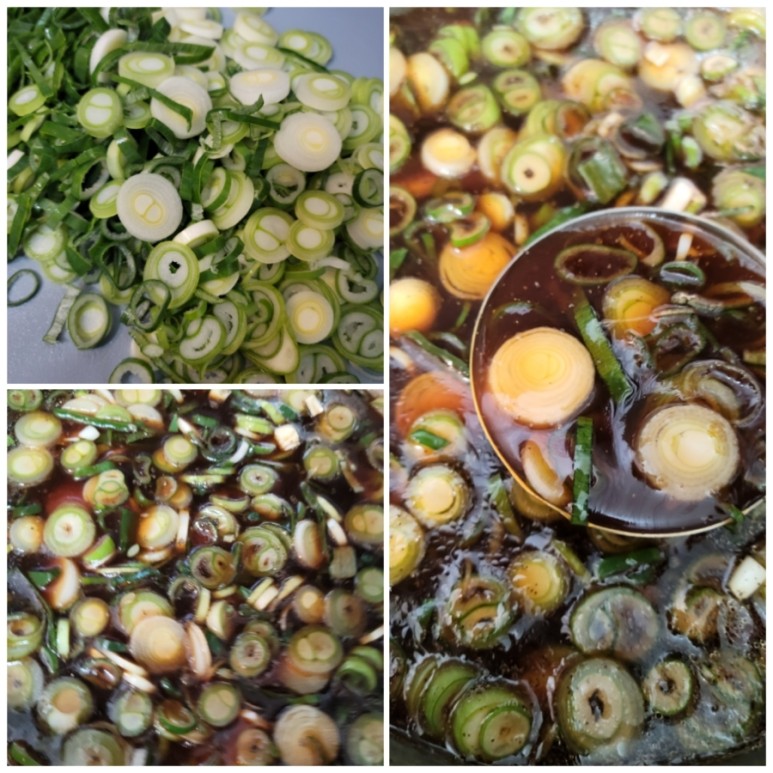 대파를 두 줄 썰어 만든 약맛에 넣고 섞은 후 냉장고에 1시간 동안 재워둡니다.
