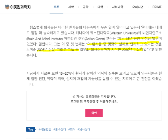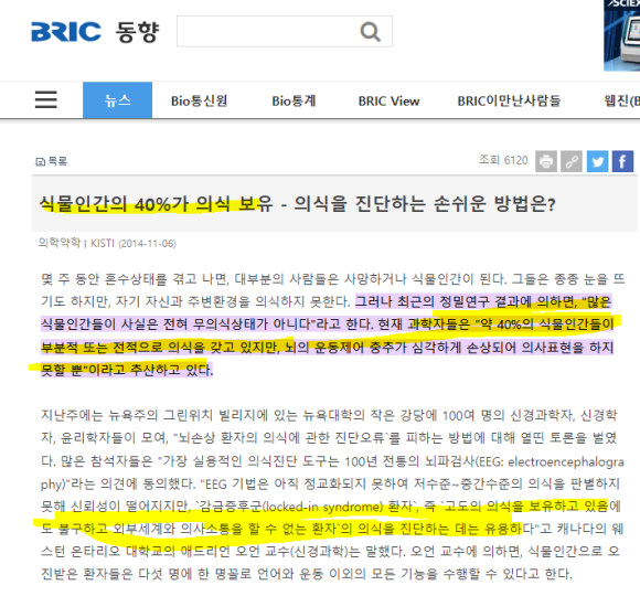 http://www.astronomer.ro cks/news/articleView.html?idxno=89596 혼수상태인 환자의 15%가 그들 주변을 의식하고 자각하고 있을 가능성이 있다는 연구가 발표되었다. 이제 그들을 다시 데려올 방법을 찾기 위한 경쟁이 시작되었다.wwww.astronomer.rocks
