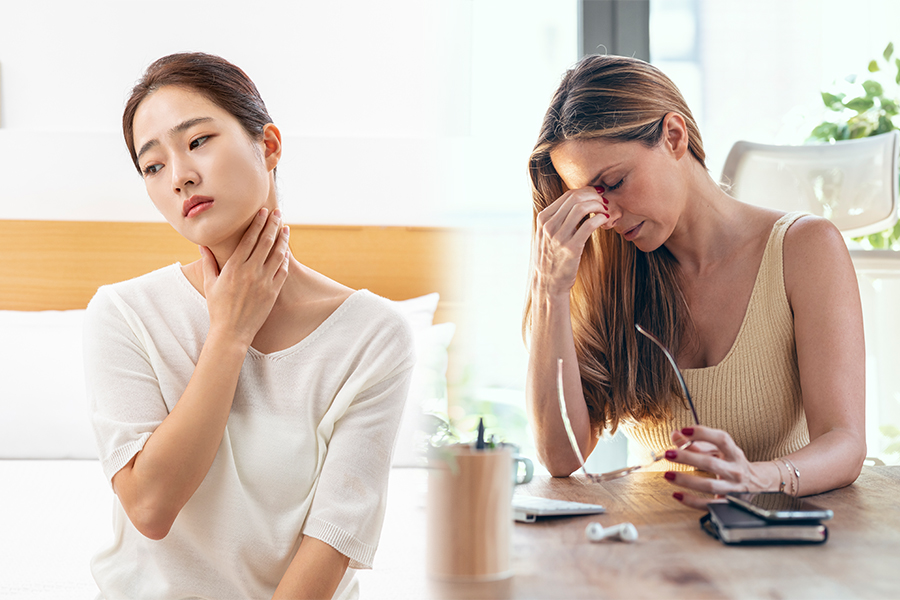 그 외에도 쉰 목소리가 나오거나 고음을 올리기 어려운 목소리의 변화가 나타날 수 있으며, 음식을 삼키기 어렵거나 호르몬 분비가 제대로 되지 않아 피로, 급격한 체중 변화 등이 발생할 수 있다고 합니다.