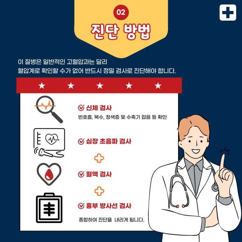 이 질병은 일반적인 고혈압과 달리 혈압계로 확인할 수 없으며 반드시 정밀검사로 진단해야 합니다.