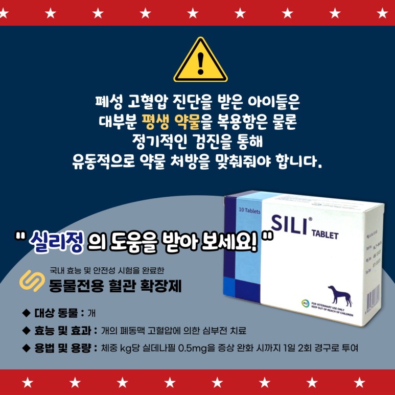 실릴정은 최초의 동물 전용 혈관 확장제로 국내에 허가를 받아 개의 폐동맥 고혈압으로 인한 심부전 치료가 가능한 약입니다.