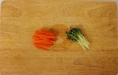 06.삶은 다시마와 으깬 두부를 적당히 올리고 당근과 무순을 넣어 돌돌 말아주세요.
