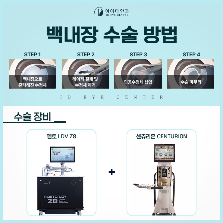 레이저로 백내장 수술을 하기도 합니다.저희 병원에서는 펨토LDVZ8, 센추리온, 자이스위트마커리스 등의 레이저를 사용하여 보다 섬세하게 접근할 수 있으며 기존 칸 등을 사용하는 방법보다 주변 조직물의 손상을 줄일 수 있다는 장점이 있습니다.