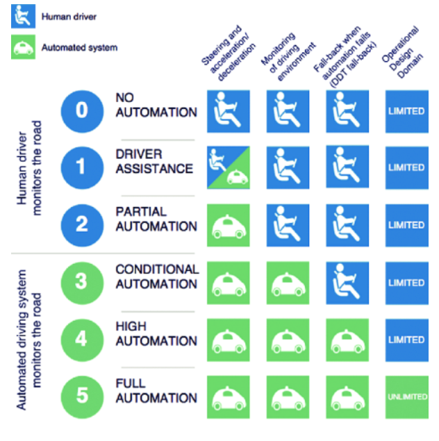 레벨 2까지는 차가 주행을 돕는 경우이며 레벨 3에서는 주도권이 차로 넘어감으로써 주행환경을 차가 주시해 운전하고 제어권을 운전자에게 넘기면 그때부터 운전자에게 수동운전을 하게 된다.(Fall-back whenautomation fails) 레벨 4 이후에는 운전자의 개입이 필요 없게 된다.