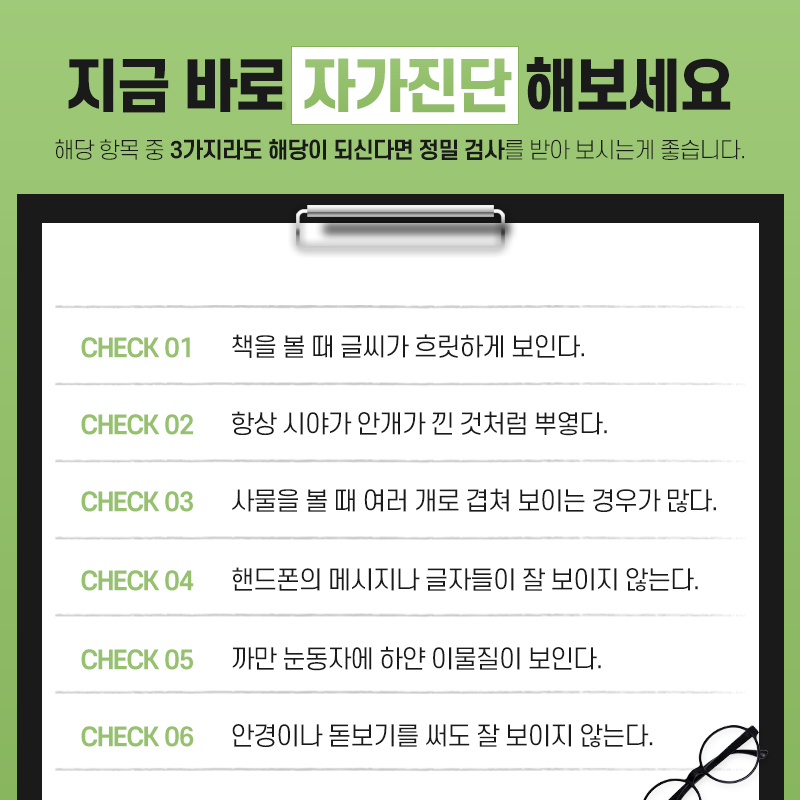 방금 말씀드린 부분이 모두 해당되지 않더라도 백내장일 수 있으므로 의심이 되시면 더 진행하기 전에 초기에 빨리 검사를 받아 보시기 바랍니다.