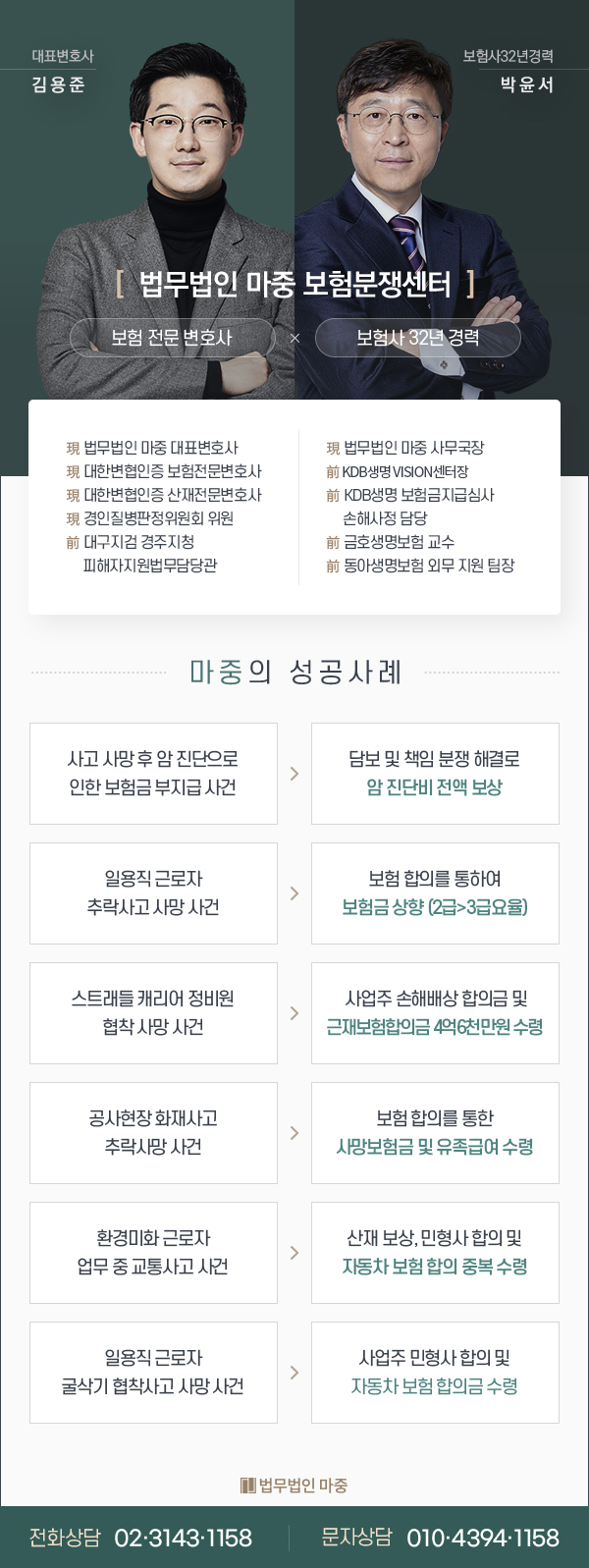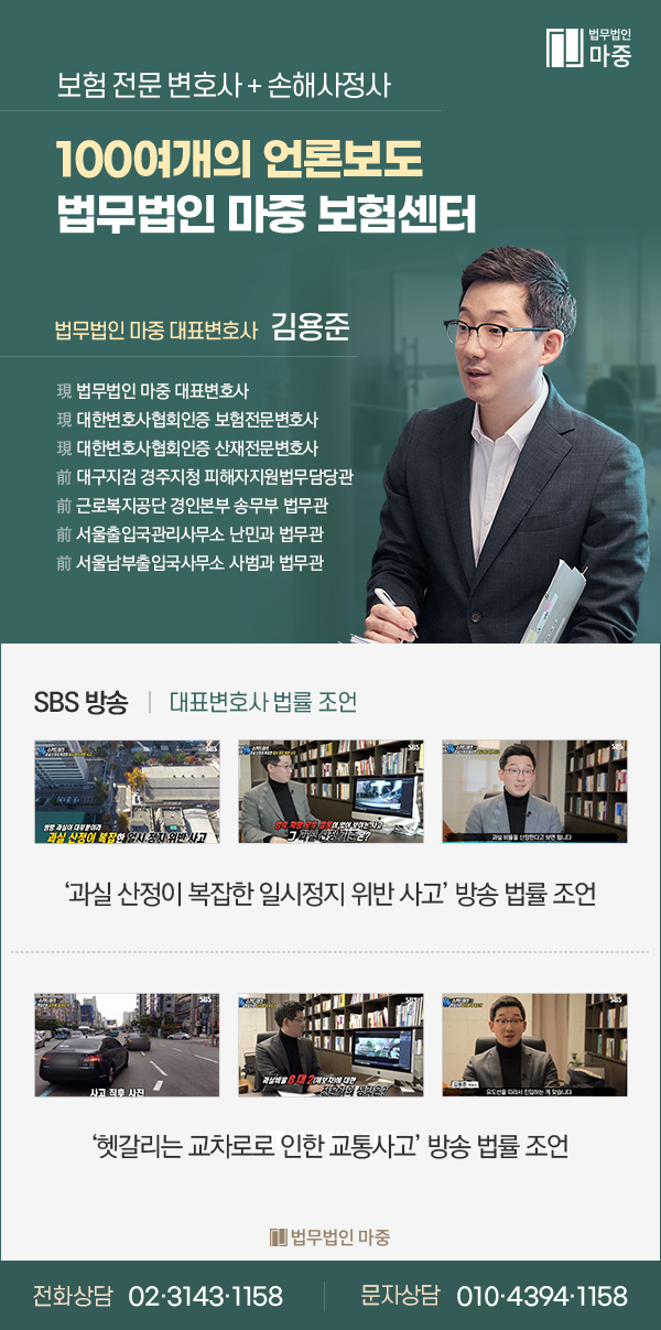 김영준 대표는 대한변호사협회 인증보험 전문 법률가입니다3만명의 법률가 중에서도 특정 조건을 갖춘 사람에게만 인정받을 수 있는 전문자격인 만큼 특별한 사건수행 경험과 노하우를 갖춘 분입니다. 따라서 보험사의 틀에 맞추어 따르는 단순한 합의가 아니라 특별한 약관을 넣어 의뢰인의 최대이익을 보장하는 ‘특인합의’를 할 수 있는 권한도 가지고 있습니다.뿐만 아니라 보험 센터에는 3분의 손해 사정사 분과 형사 전문 법률가, 그리고 보험 35년 경력의 사무 국장이 동행하고 있습니다. 국장님은여러보험회사에서근무한경험이있기때문에보험회사내부에서어떻게실무를수행하는지,어떤전략을전개하는지자세히파악하고있네요.덕분에 마중을 믿고 함께해주시는 의뢰자분들의 권리와 이익을 지킬 수 있었습니다.