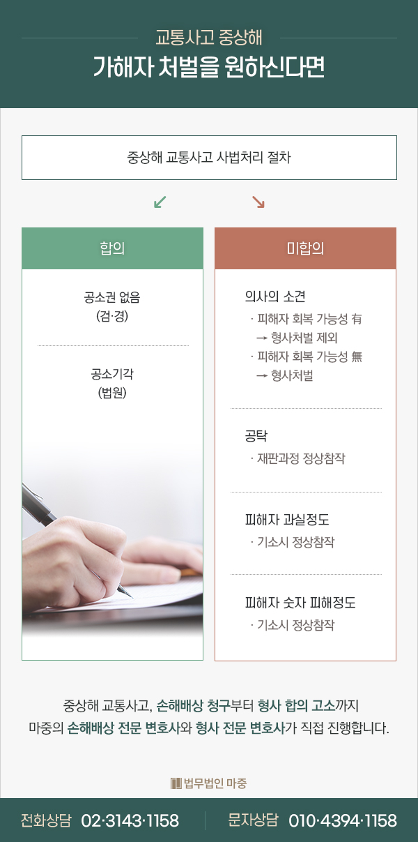 마중은 우선 피해자분의 산재 신청을 도와드리고, 그 후 형사 합의를 진행했습니다. 피해자 분이 전치 8주 이상의 진단을 받은 상태이기 때문에 가해 차량의 운전자는 형사처벌을 받게 된 상황이었지만요. 의뢰자분들도 치료비로 인한 경제적 부담이 커 합의를 필요로 하는 상황이었기 때문에 최대한 합의금을 도출합니다. 다음으로 자동차 보험 회사와 합의를 진행하려고 했는데, 산재가 승인되어 피해자에게 유리한 상황이 되었습니다.여세를 몰아 합의를 진행하여 무단횡단이라는 큰 과실이 있었음에도 불구하고 본인 부담분을 제외한 치료비를 보상받을 수 있게 되었습니다. 마중을 믿고 동행해 주셔서 대단히 감사합니다.교통사고 장애로 힘들다면 놓치고 있는 보상은 없는지 다시 한 번 확인해 보세요.픽업시 문자, 전화, 온라인 문의를 남겨주시면 전문가가 여러분의 상황을 정확하게 진단하여 올바른 방법을 마련해 드립니다.항상 성실히 모시고 있으니 믿고 맡겨주세요.서울특별시 종로구 새문안로 92 광화문오피시아 406,407,408,410,411호