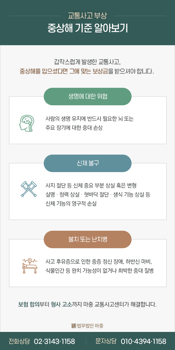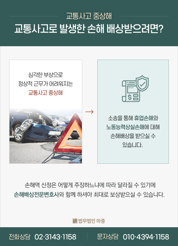 안녕하세요 법무법인 맞이 보험분쟁센터입니다오늘은 교통사고로 인해서 장애가 남으면 어떻게 보상을 받아야 하는지 말씀드리고 싶습니다.먼저 교통사고 보상 산정 방법에 대해 알아보고, 노동능력 상실률이 무엇인지, 합의는 어떻게 해야 하는지 순서대로 설명하겠습니다.