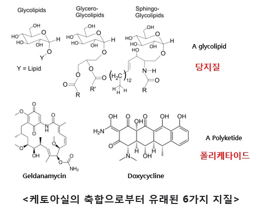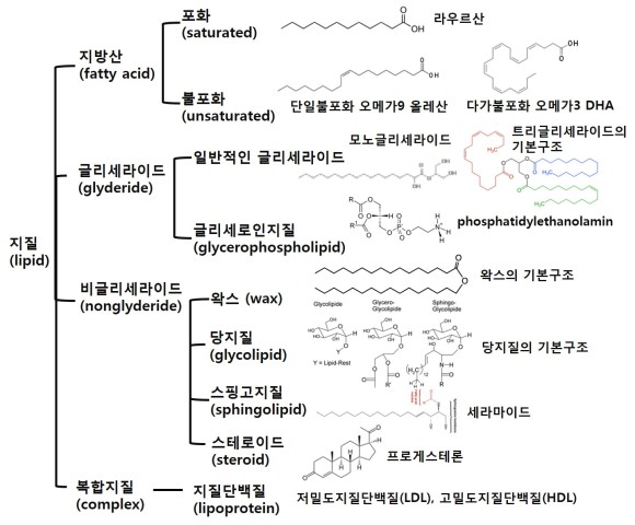 지질(Lipid)을 구분하면 여러 분류법이 있는데 일반적으로 8가지로 분류를 합니다. 이들 8종은 케토아실(ketoacyl) 축합과 아이소프렌(isoprene) 축합에서 유래한 것으로 나뉘는데, 케토아실(ketoacyl) 축합에서 유래한 6종은 지방산, 글리세롤 지질(주로 트리세라이드, 중성지방), 글리세롤 지질(인지질의 주요 형태), 스핀고지질(스핑고신을 포함하는 지질), 당지질의 글리세라이드 결합), 폴리케톤과 메틸렌기가 유래한다.