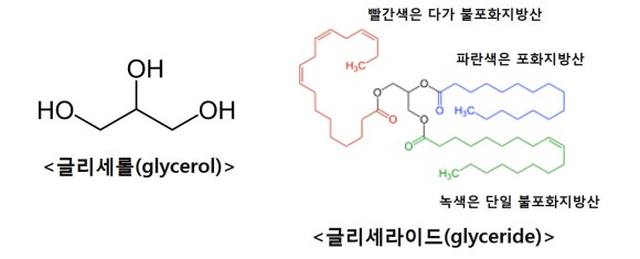 글리세롤(glycerol)은 알코올의 일종으로 무색, 무취 액체이며 글리세린(glycerin)이라고도 합니다. 단맛을 내기 때문에 당알코올로도 분류합니다. 점성이 매우 강한 특징이 있습니다. 글리세린은 3개의 수산기를 가진 3가 알코올입니다. 지방산과 마찬가지로 유지 또는 지방의 구성 성분입니다.