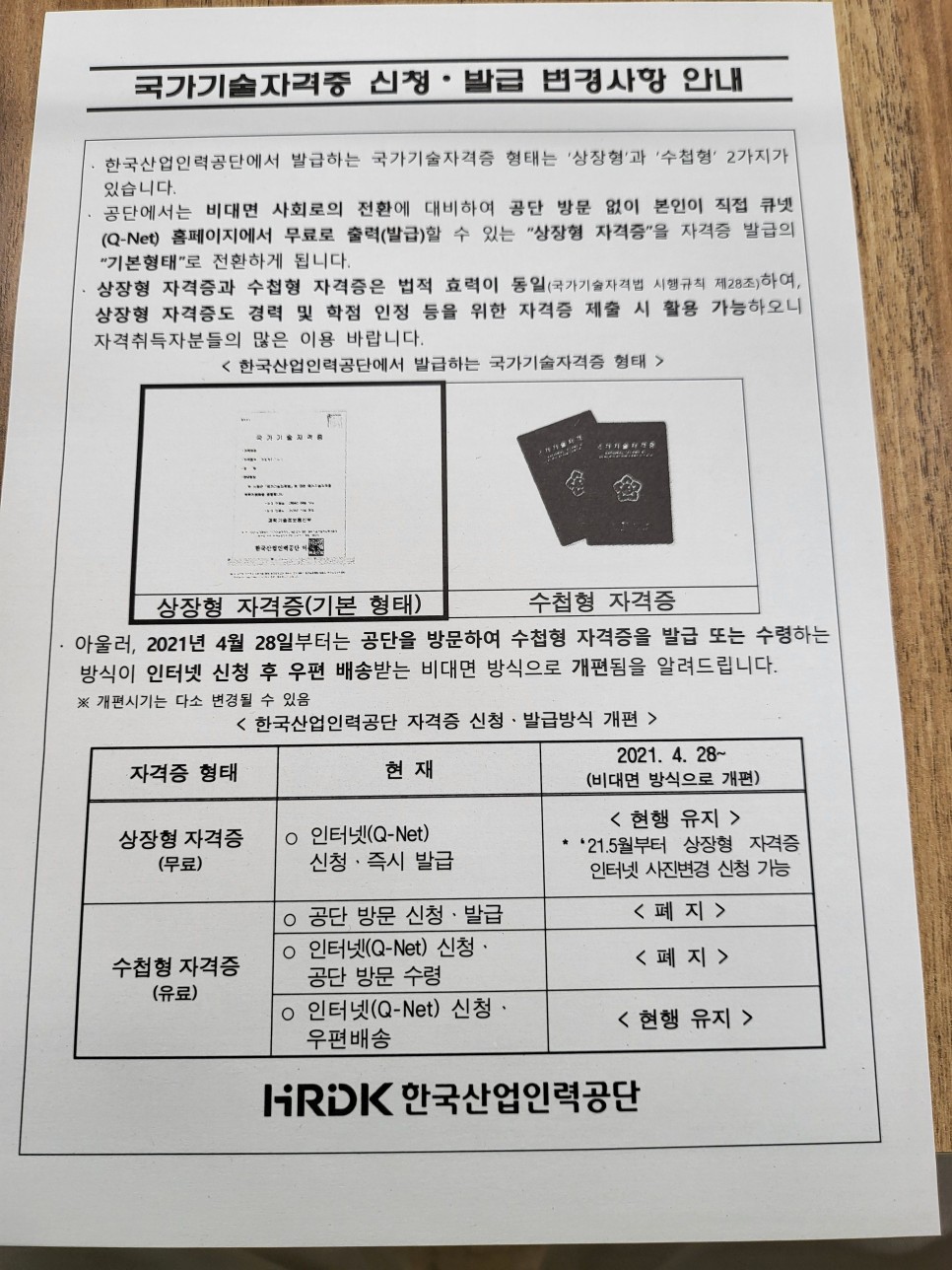 참고로 증명사진은 직접 방문하여 등록해야 하지만 자격증 신청/발급은 온라인으로만 가능하다는 것이 조금 아이러니합니다. 굳이 왜 이렇게 바꿨는지 잘 모르겠어요.홈 자격/확인서 자격증 발급 신청 자격증 발급 신청 『상장형 자격증』 발급·활용 한국산업인력공단에서 발급하는 자격증은 「상장형 자격증」을 원칙으로 합니다. 공단에서 발급하는 자격증은 그 형태(상장형, 수첩형)에 관계없이 법적 효력이 동일(국가기술자격법 시행규칙 제28조)이며 상장형 자격증도 경력 및 학점 인정 등을 위한 자격증 제출 시 활용할 수 있습니다. 특히 상장형 자격증은 발급 수수료가 없고(무료발급), 인터넷으로 편리하게 신청하고 자가 프린터를 통해 즉시 발급(출력)할 수 있으므로 공단…www.q-net.or.kr 자격증의 종류는 상장형과 수첩형이 있습니다. – 상장형은 말 그대로 상장과 같이 A4 규격으로 발급되는 자격증 형태입니다. 현재의 기본 형태는 이 상장형으로 그대로 집에서 프린트하면 발급받을 수 있습니다.