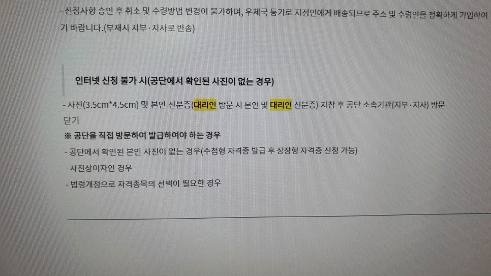 따라서 현역이 시험에 합격하더라도 자격증 발급을 하려면 실질적으로 휴가를 내고 한국산업인력공단 지점에 간 후 본인 증명사진을 등록하고 발급 신청을 해야 발급을 받을 수 있습니다. 문의 결과 군내에서 자격증을 발급받을 방법은 없습니다.저도 이 때문에 자격증 발급에 어려움을 겪고 있기 때문에 저처럼 현역 때 자격증을 취득하신 분들을 위해 포스팅을 작성해 보겠습니다.