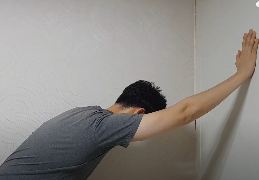 첫 번째는 팔을 위로 올리는 동작인데 통증이 심할수록 팔이 머리에서 벗어나는 방향으로 열립니다. 가급적 귀 바로 옆으로 들어 올린다는 느낌으로 벽에 손을 대고 몸을 눌러 스트레칭을 하십시오.