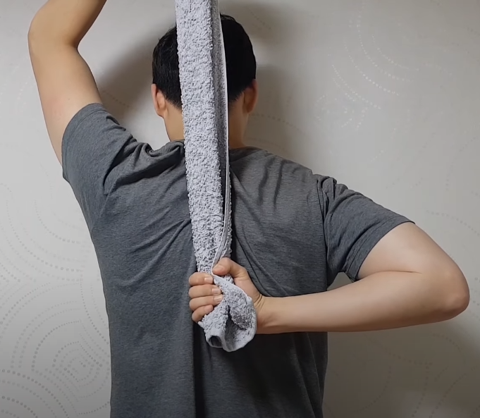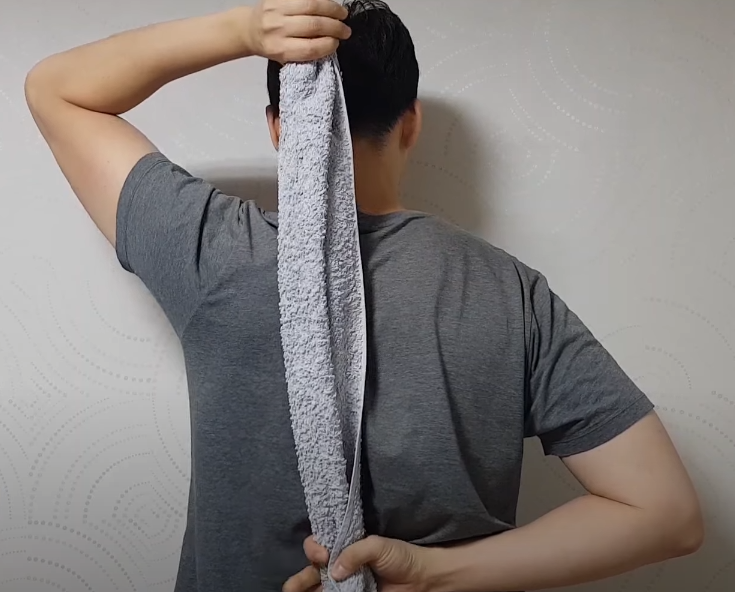 세 번째는 팔을 뒤로 올리는 스트레칭입니다. 타월이나 끈을 이용해 주세요. 통증 없는 반대 팔로 머리 위에서 수건을 늘어뜨려 관절이 단단해진 부위의 팔을 끌어올리는 스트레칭을 하십시오.