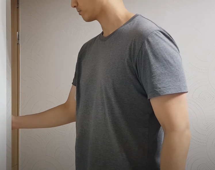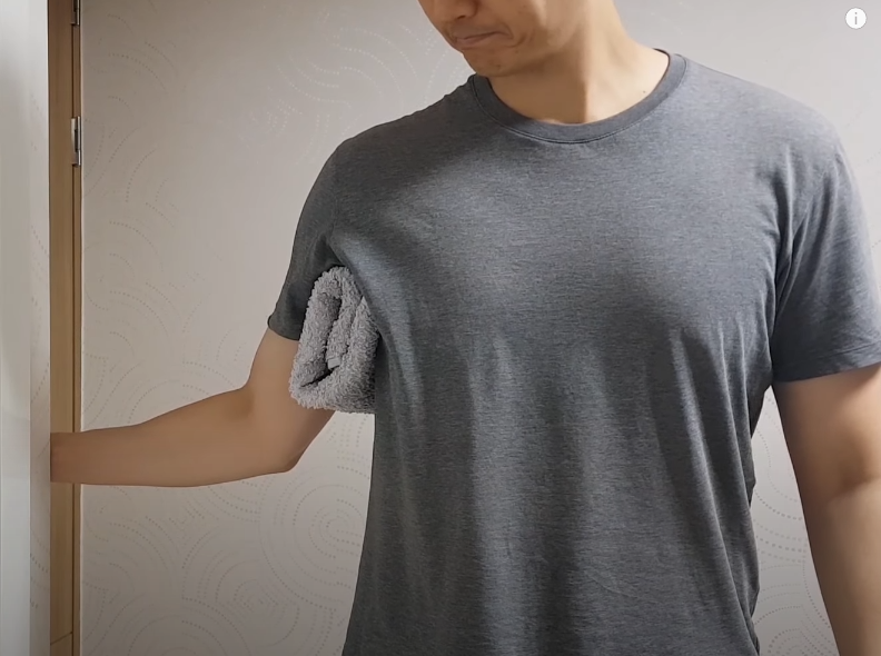 두 번째는 팔을 바깥쪽으로 넓히는 스트레칭입니다. 겨드랑이 밑에 수건을 끼워 손을 벽이나 고정된 물체에 붙인 후 몸통을 돌려 팔이 바깥쪽으로 퍼지는 스트레칭을 하십시오.