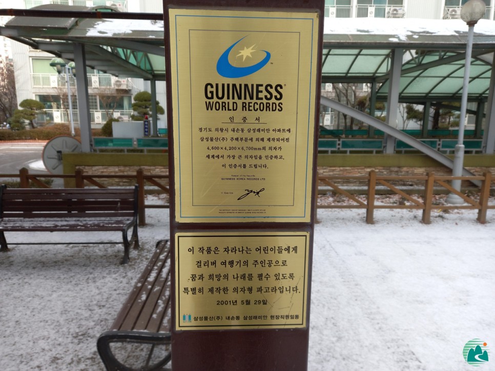 초대형 의자가 한국기네스북에 오른 것은 2001년 3월 28일 기네스북에 접수됐고, 그해 5월 25일 기네스심의위원회의 최종 심의를 거친 결과 한국기네스협회로부터 ‘국내에서 가장 큰 의자’로 인증을 받았다고 합니다.