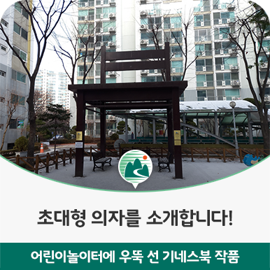초대형 의자가 있는 이곳은 의왕시내수 2동(포일로 39)에 위치한 삼성래미안아파트 단지 내 어린이 놀이터로 의자 크기는 4600 X 4200 X 6700 재질은 STL판 THK 3.5mm 철구조, 내부 모래채움 외부 우레탄도료 락카(lacquer) [2005-07-05] 조경물로 설치되어 있습니다.