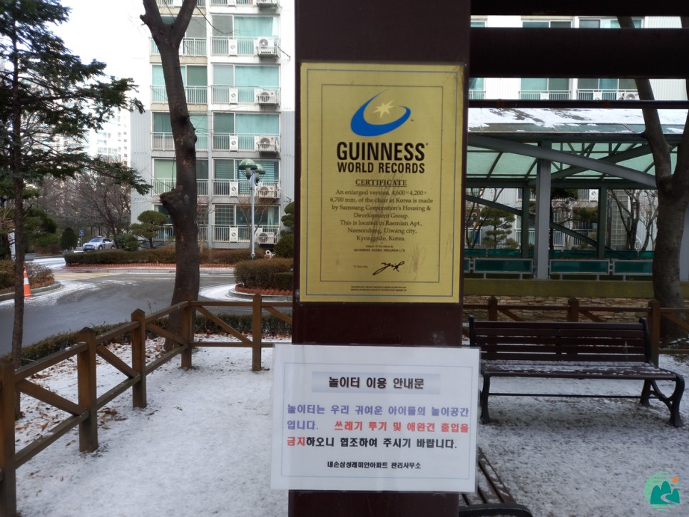 이렇게 아파트 놀이터에 선 기네스북에 오른 사실만으로도 많은 이들의 각광을 받기에 충분합니다. 그러나 기네스북에 오른 훌륭한 작품인 점을 감안하여 해당 작품이 지속적으로 영구 보존될 수 있도록 앞으로 거주자는 물론 이용자 모두가 안전관리 및 시설 보호에 더욱 많은 신경을 썼으면 합니다. 아울러 경비원 아저씨와 미화원 여러분의 노고에 감사드립니다.