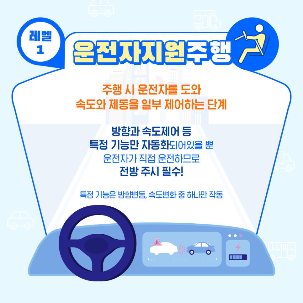 자율주행 Lv.1 레벨 1 주행 시 운전자를 도와 속도와 브레이크 일부를 제어.