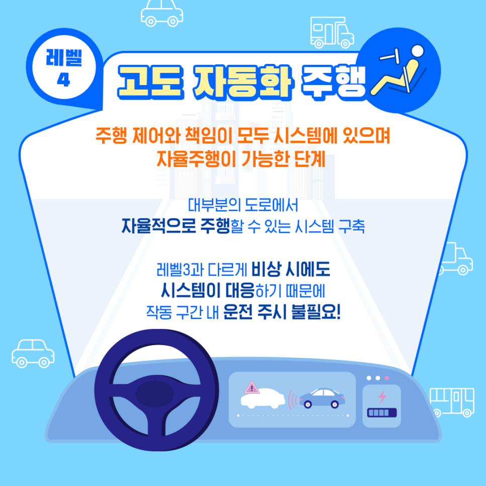 주행 제어와 책임이 모두 시스템에 있으며 대부분의 도로에서 자율주행이 가능한 단계입니다.