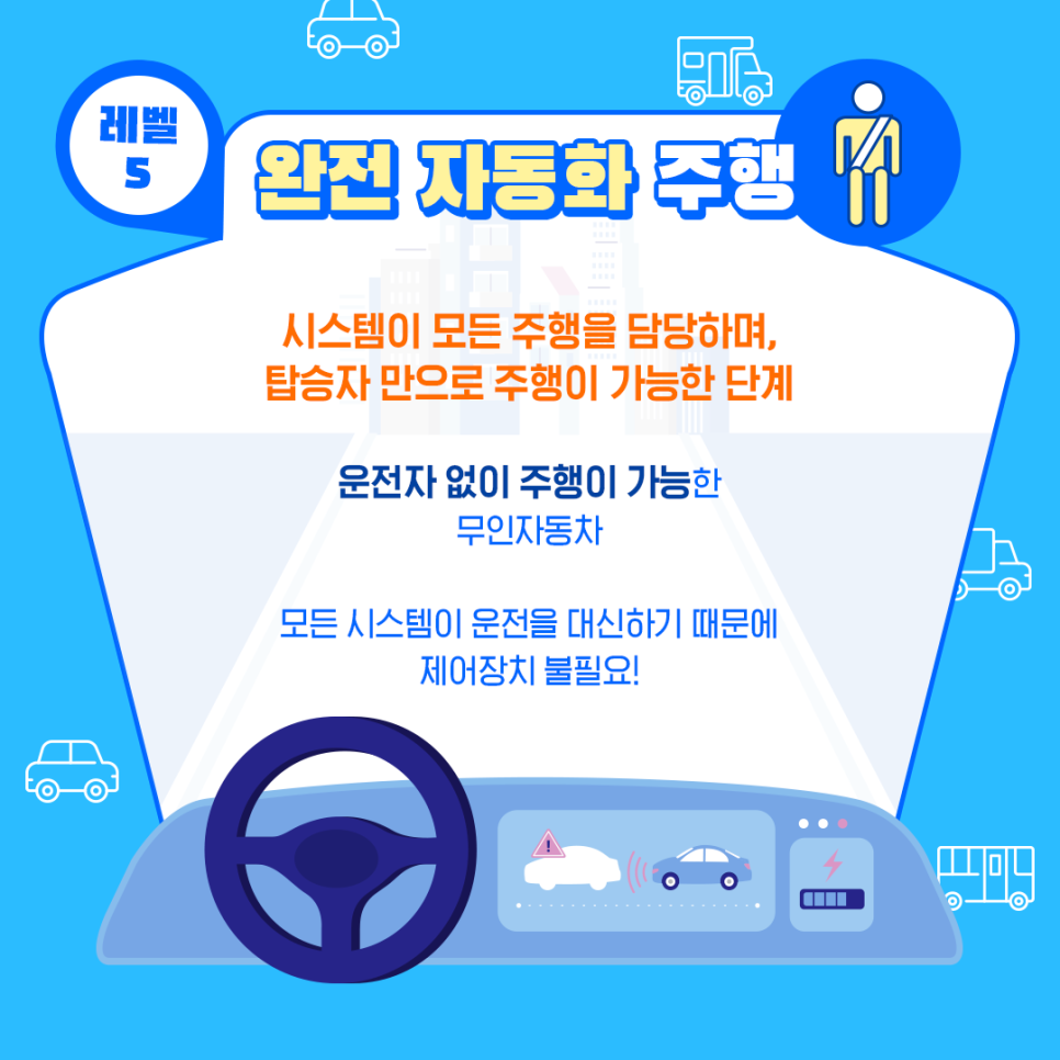 자율주행 Lv.5 레벨5 완전 자동화 단계에 시스템이 모든 주행을 담당하고 운전이 이뤄져 운전자가 필요 없는 단계입니다.