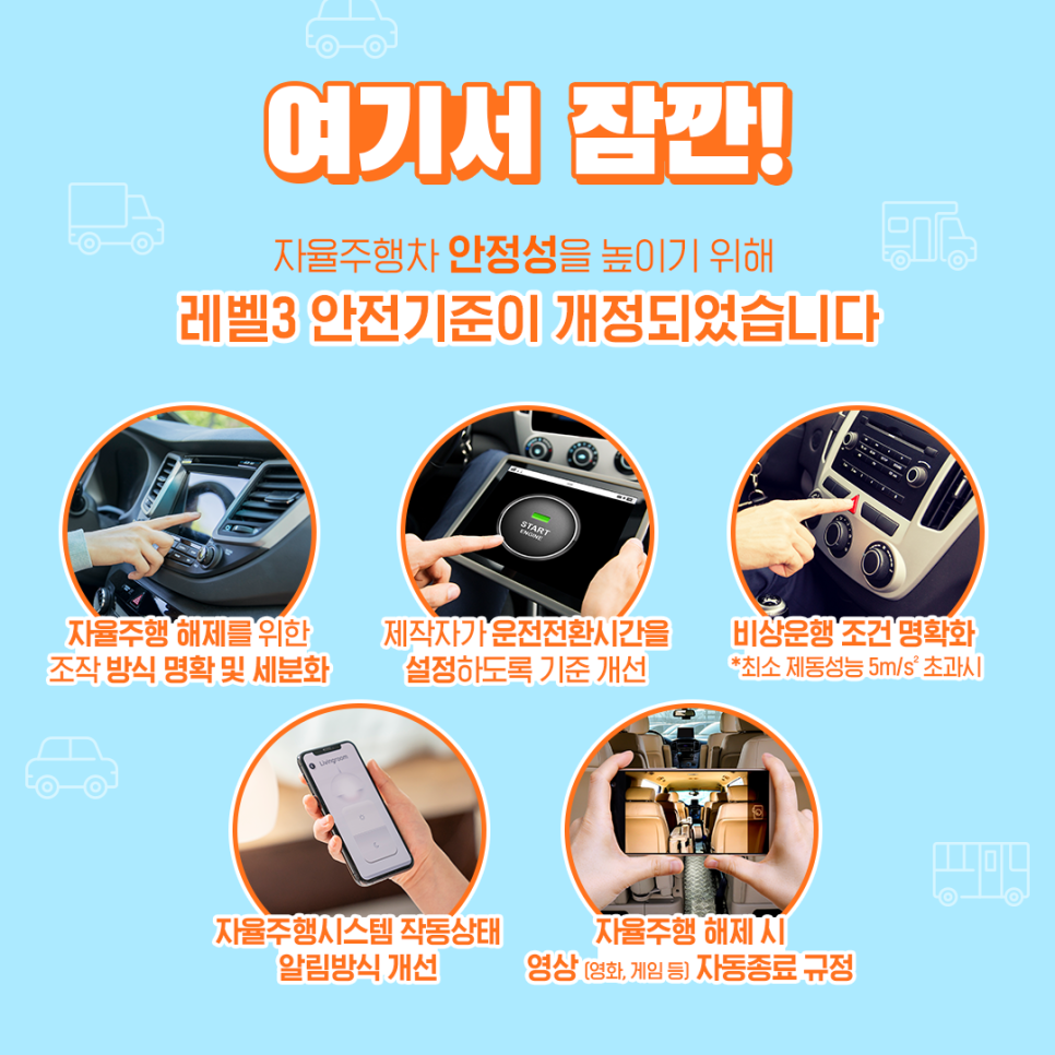 자율주행 Lv.3. 안전기준 개정 여기서 잠깐!자율주행차의 안정성을 더욱 높이기 위해 레벨3 안전기준이 개정됐습니다.
