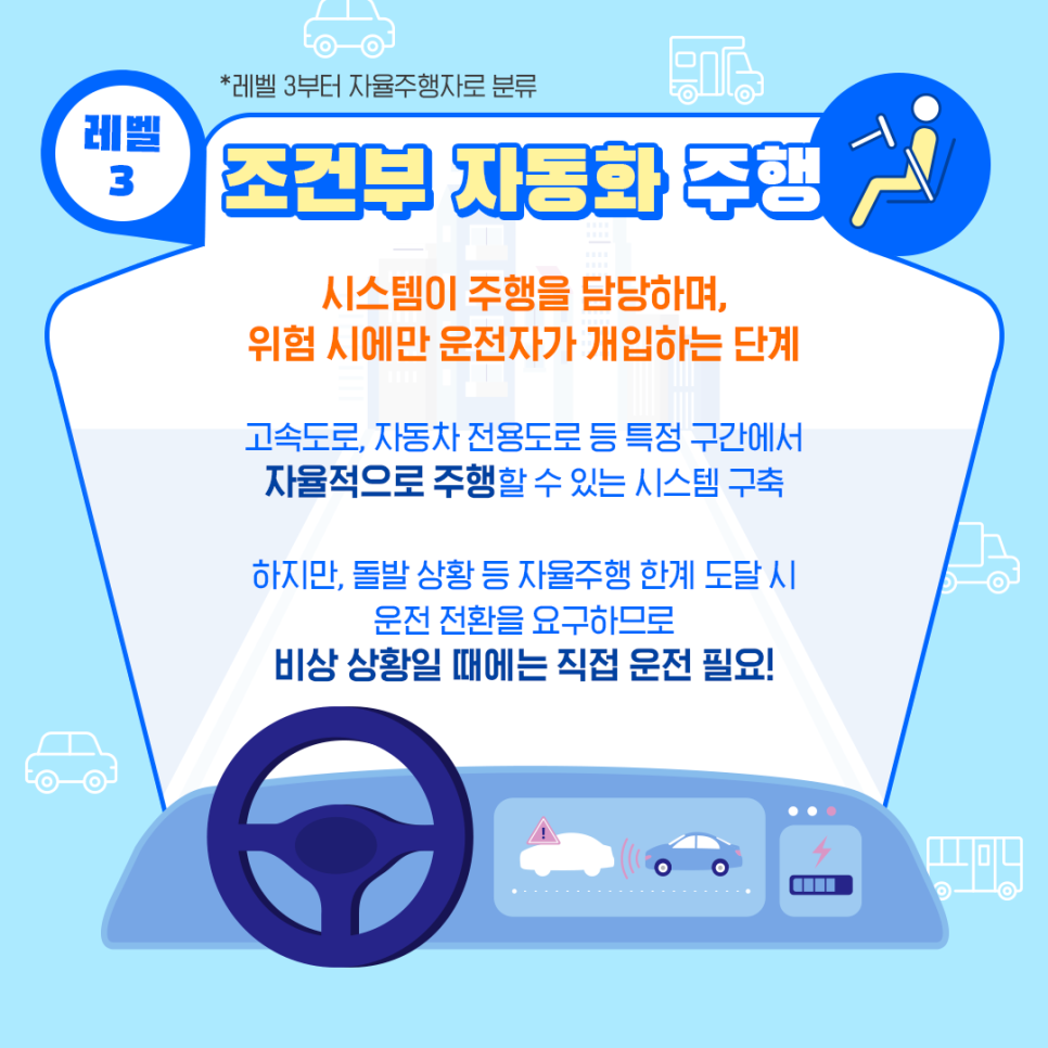 레벨 3 주행 시 시스템이 대부분의 주행을 담당하며 위험한 상황에서만 운전자가 직접 개입하는 단계