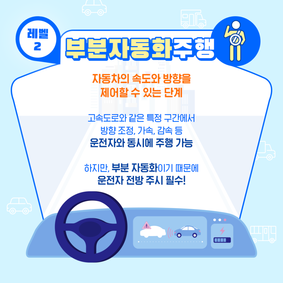 자율주행 Lv.2 레벨 2 부분의 자동화 주행으로 고속도로와 같은 특정 구간에서 방향 조정과 속도를 줄이거나 높이는 등 운전자와 동시에 주행할 수 있는 단계
