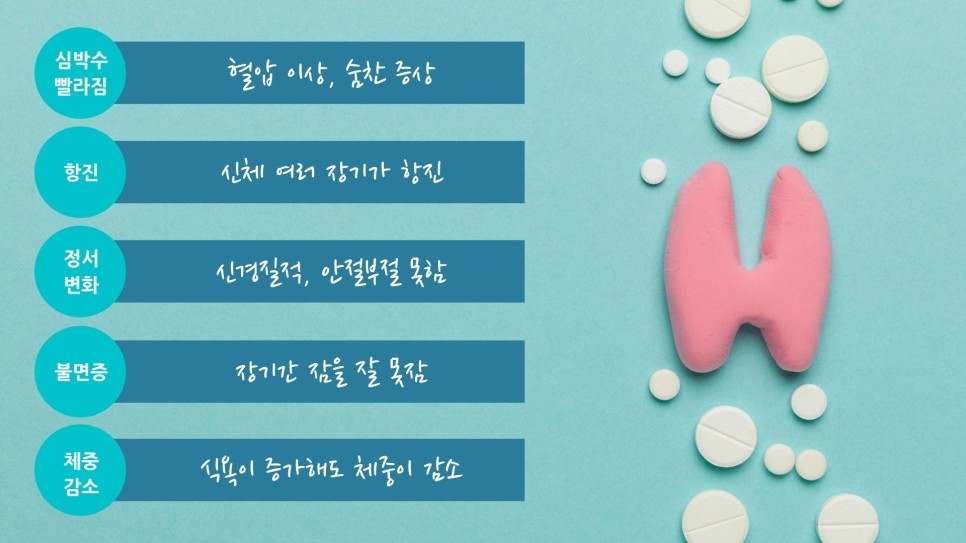 - 신체의 여러 장기가 항진해 있어 가만히 있어도 달리는 효과가 나타납니다.2. 심박수가 빨라지고 혈압이상, 숨이 차는 증상이 나타납니다.3. 신경질적이고 침착하지 못하고 감정의 변화가 심해지는 정서변화가 나타납니다.4. 불면증도 생깁니다. 5. 식욕이 증가해도 체중이 감소합니다.6. 설사나 변비와 같은 소화기 증상이 나타납니다.7. 피부가 건조하고 땀이 많이 나고 머리카락이 많이 빠집니다.