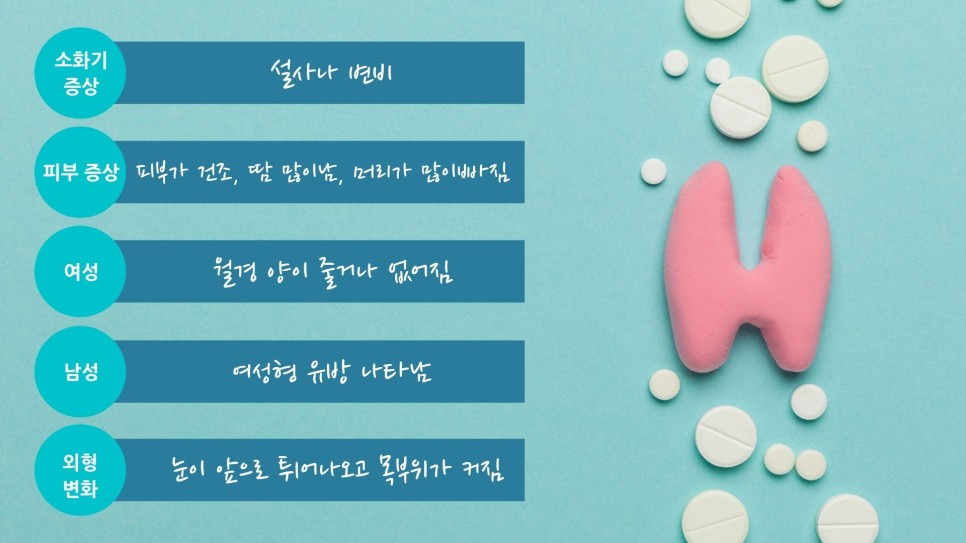 8. 여성의 경우 월경의 양이 줄거나 없어집니다. 9. 남성의 경우 드물지만 여성형 유방이 생길 수 있습니다.10. 외형적으로 눈이 앞으로 튀어나오고 목 부위(갑상선 부위)가 커지는 증상이 생깁니다.