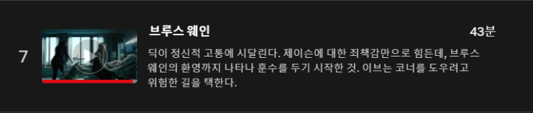 시즌1을 재미있게 봐서인지 시즌2도 재미있게 시청했지만 시즌1의 히어로 등장이나 액션보다 딕과 히어로들 각각의 내적 갈등과 서로의 갈등, 그리고 과거 이야기들이 많이 다뤄져서 이야기가 실제로 많이 진행된 것은 아닌 것 같다.