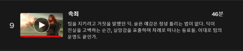 팀을 지키려고 거짓말을 했던 딕 슬픈 예감은 아무래도 틀릴 게 없다 딕이 진실을 고백하는 순간 실망감을 드러내며 차례로 떠나는 동료들. 이대로 팀의 운명도 끝인가.