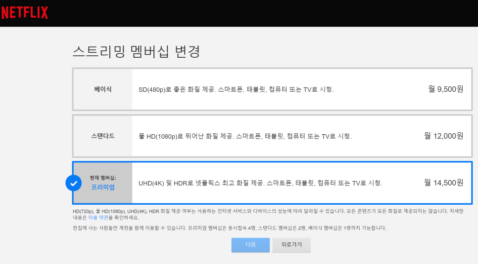 프리미엄은 4K UHD 해상도로 시청 가능하며, 동시 접속은 4대까지 가능합니다. 그래서 가족이 많거나 친구와 함께 사용할 때 가장 좋습니다. 구독료는 일시적으로 나누어 지불하면 그다지 부담이 되지 않는 수준입니다.