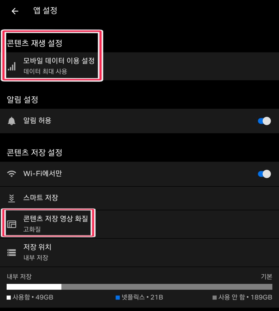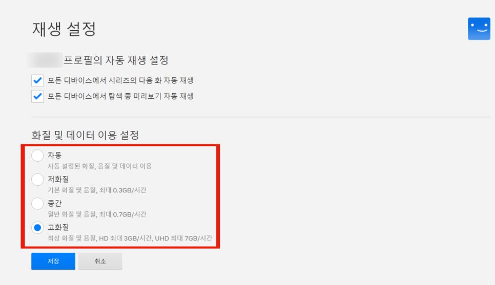 여기서 제일 위에 있는 컨텐츠 재생 설정을 데이터의 최대 사용으로, 중간에 있는 보존 영상의 화질은 고화질로 변경해 주세요. 다음부터는 최대 화질로 스트리밍이 됩니다.
