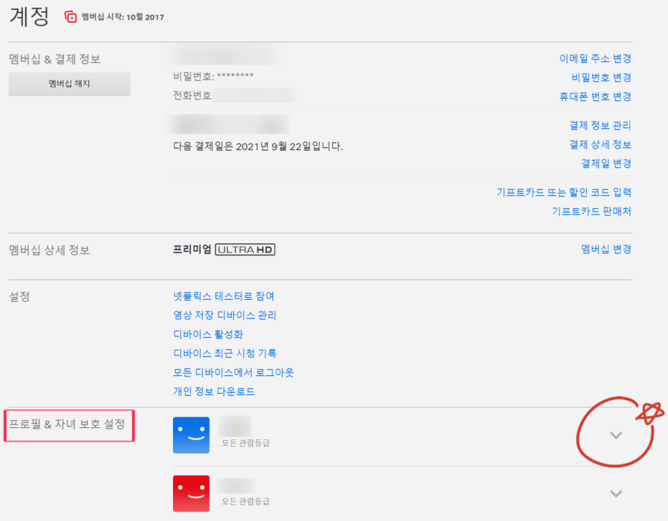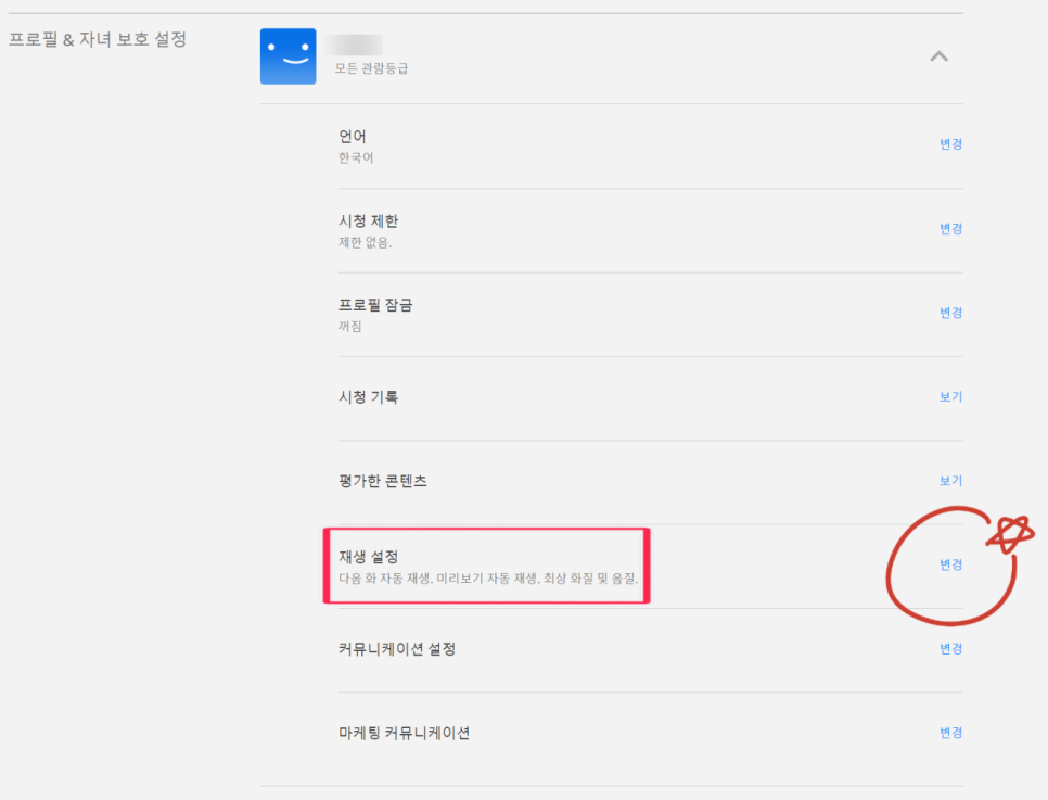 계정 > 프로필 & 어린이 보호 설정에서 변경하고자 하는 프로필 오른쪽 끝에 있는 화살표를 누릅니다.