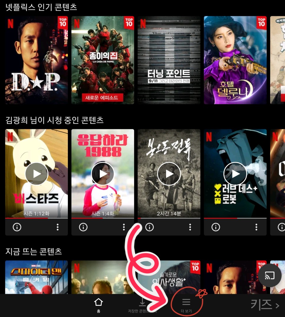 모바일은 더 쉬워요 NETFLIX 앱을 실행하고 하단에 위치한 더보기를 눌러보세요.