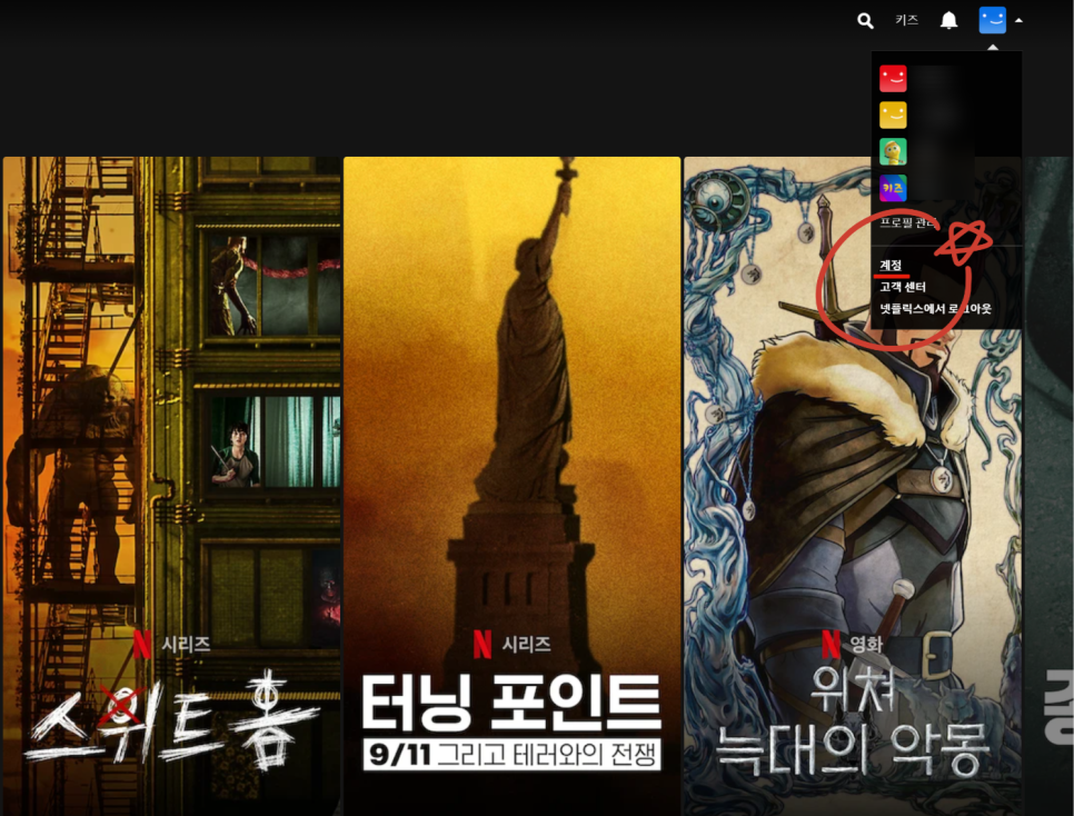 다음은 넷플릭스의 화질 설정에 대해 알아보겠습니다. 정말 간단하네요. 먼저 PC에서 설정을 변경하기 위해서는 웹 브라우저로 넷플릭스 홈페이지에 로그인해야 합니다. 그런 다음 오른쪽 상단의 아이콘을 클릭하여 계정으로 들어갑니다.