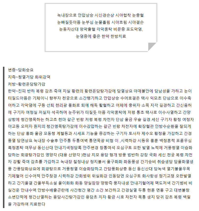 본원에서는 여러 눈병으로 인해 치료를 받으러 내원하는 환자가 있기 때문에 자신의 증상이나 질환에 맞는 한방 치료를 실시하고 있습니다. 같은 질환이라도 증상의 정도나 진행단계가 다를 수 있으며, 녹내장으로 내원한 환자라도 눈부심이 심하거나 시야가 흐린 증상이 두드러지며, 안구가 부어 있거나 충혈과 통증이 생긴 경우 등 각기 다른 치료가 이루어집니다. 환자의 증상은 물론 나이와 성별, 고유한 체질도 치료를 위해 고려해야 하는 요소이기 때문에 이 부분도 반영해서 맞춤침 치료와 한약 처방을 하고 있습니다.