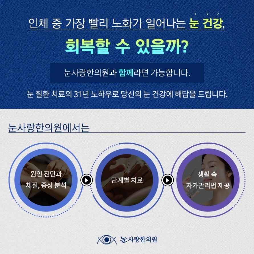 눈병은 충치를 치료하듯 한두 번 내원으로 바로 좋아지는 것은 아니므로 단계별 계획을 세우고 중간에 시야협착이 얼마나 개선되었는지, 안압이 정상 범위에 있는지를 확인하면서 치료계획을 조절하게 됩니다. 눈 건강이 나빠져 있으면 컨디션도 나빠져 있을지도 모르기 때문에 이 부분도 회복할 수 있도록 돕고 있어요. 이러한 전반적인 치료를 통해 좋은 효과를 얻을 수 있기 때문에 믿고 치료를 받을 것입니다.