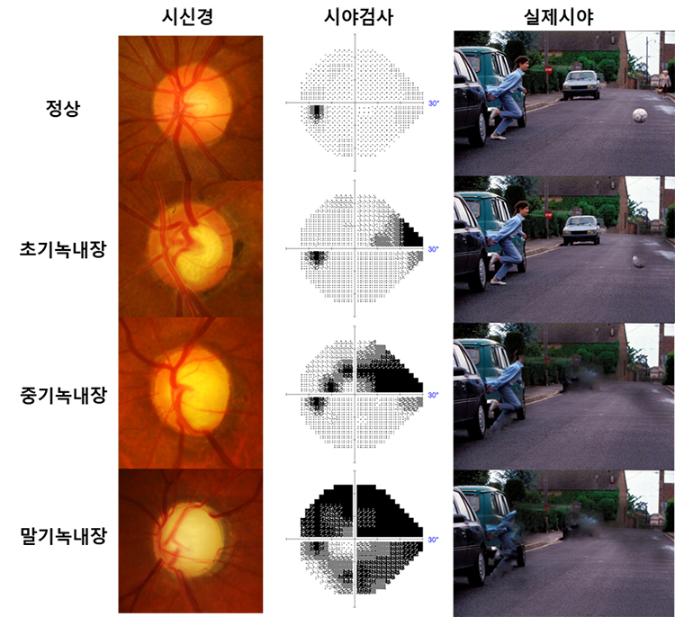 환자가 느끼는 실제 시야 변화/분당서울대병원 안과 제공 녹내장 초기에는 시야에 암점이 생겨 주변에 있는 물건을 인지하지 못하게 되지만 본인이 증상을 느끼기는 어렵다. 질병이 점차 진행되면서 암점의 범위가 넓어져 중심 시야 가까이 침범하면 비로소 증상이 느껴지는데 이때는 이미 녹내장 중기 이상으로 진행된 경우가 대부분이다. 시야 손상 범위가 커져 말기에 이르면 터널 안에서 밖을 보듯 주변 시야가 좁아지고 중심부만 보이게 된다. 이런 경우 길을 걷다가 자주 부딪혀 계단을 오르내릴 때 넘어지는 경우가 많아져 작은 물건을 찾는 데도 시간이 오래 걸린다. 여기서 병이 더 진행되면 시력이 떨어지고 결국 실명에 이르게 된다. 실제로 필자가 맡은 말기 녹내장 환자 중에는 “안개 속에서 살아가는 것 같다”고 호소하는 환자도 있었다.