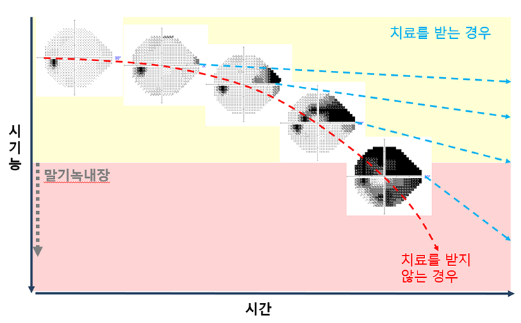 시간에 따른 녹내장 진행속도 변화. 치료를 받아도 완치는 어렵지만 녹내장 진행속도를 완화할 수 있으며 조기에 치료를 시작할수록 진행속도 기울기가 더욱 완만해질 가능성이 높다/분당서울대병원 안과제공 녹내장 조기진단에 앞서 언급했듯이 만성개방각 녹내장, 특히 정상안압 녹내장의 경우 말기에 이르기까지 거의 증상을 느끼지 않는다. 한번 손상된 시신경은 회복되지 않기 때문에 조기진단 및 조기치료가 녹내장으로 인한 실명을 막는 유일한 방법이다.우선 조기진단을 위해서는 안과를 방문해 다양한 검사를 받아야 한다. 나이가 들수록 녹내장에 걸릴 확률이 높아지므로 기본적으로 40세부터는 눈에 불편함이 없더라도 1~2년 간격으로 정기검진을 통해 녹내장 검사를 받는 것이 좋다. 특히 녹내장 가족력이 있거나 당뇨병이나 고·저혈압이 있는 경우, 근시나 원시가 심한 경우 등 ‘녹내장에 걸릴 가능성이 높은 경우’에는 40세 미만이라도 녹내장 검사를 받는 것이 좋다.